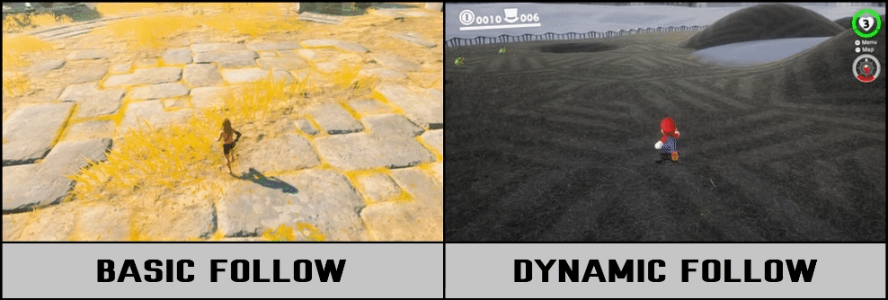The most basic way to implement a third person camera is to have it follow the player’s position with an offset. This approach is great for exploration focused games, racing games, dungeon crawlers, and many others. For action games, however, a more dynamic hands-on approach can be beneficial. My goal is to implement a camera that follows the player and rotates as they move, similar to those seen in games like Super Mario Odyssey and Kingdom Hearts.